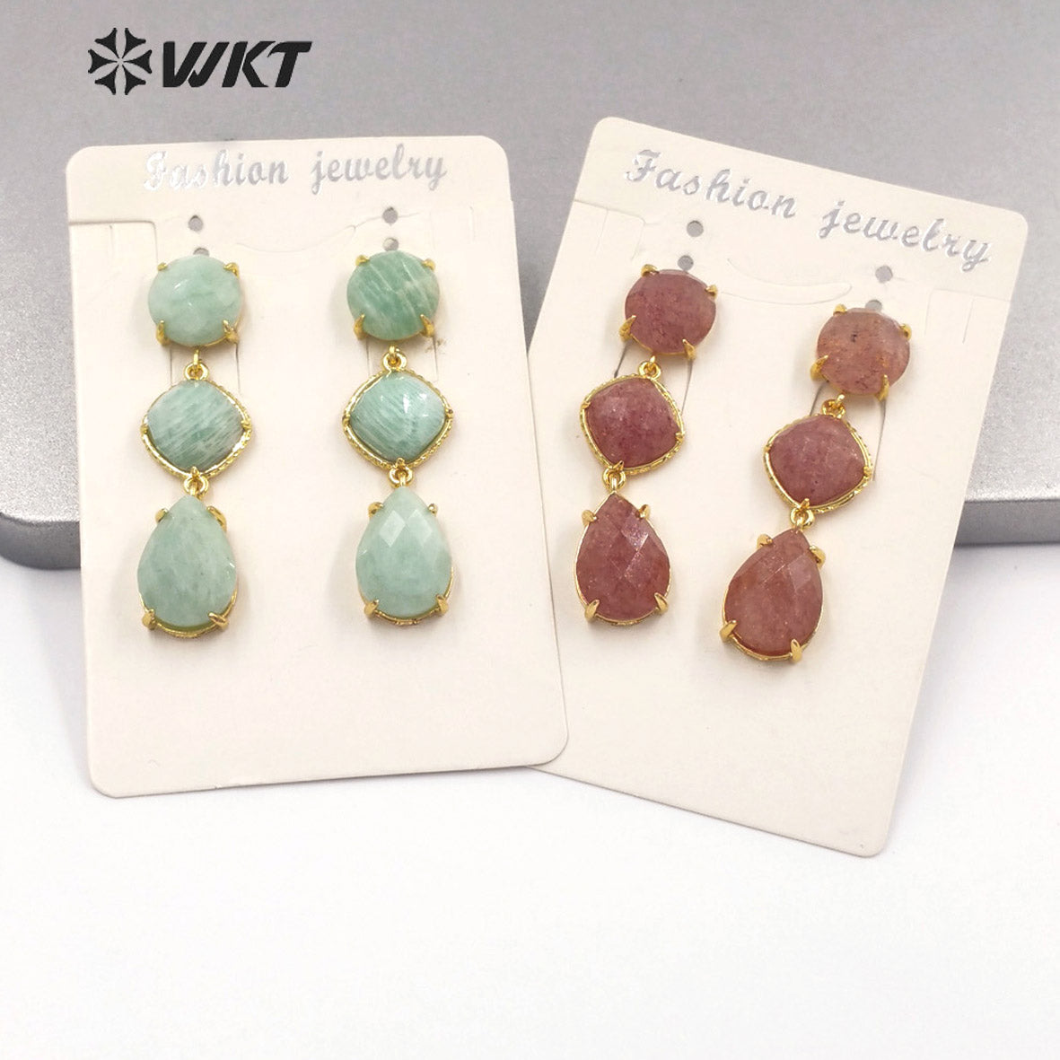 WT-E689 Wholesale Fashion Triple Stone Long Dangle Earrings Gorgeous Lady Prong Setting Natural Gemstone Birthday Stone Earrings