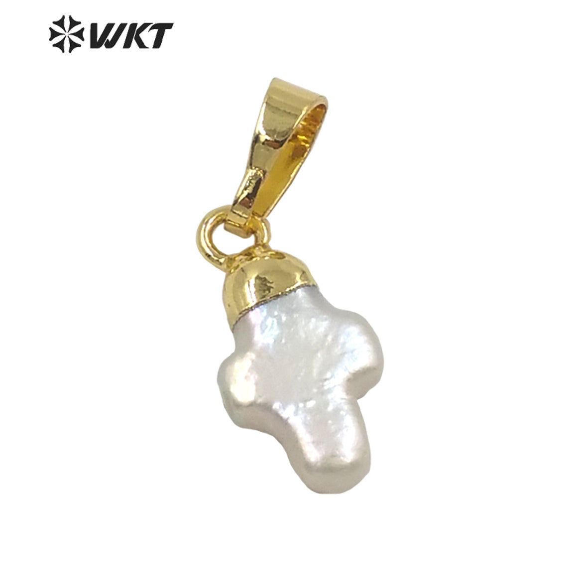 WT-JP246 WKT Newest Natural Freshwater Pearl Cross Pendant Fashion Lady Gold Top Single Loop White Pearl Charm Pendant in Cross