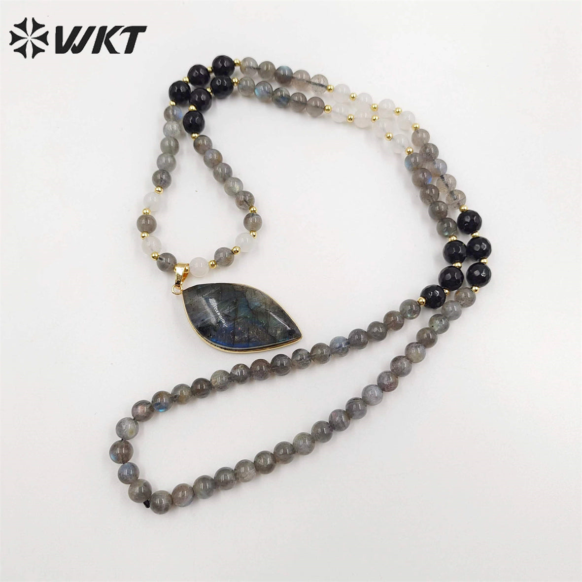 WT-N1417 New Handmade Long 6mm Round Beads Labradorite Pendant Necklace Women Trendy Shirt Chain Casual Boho Chain