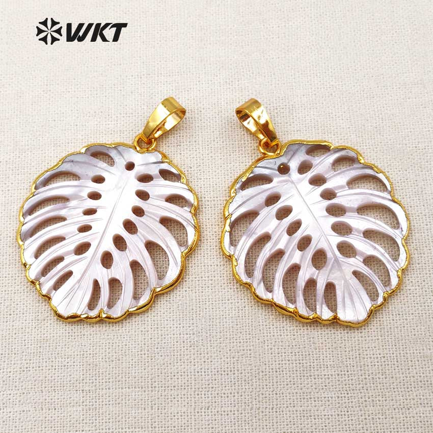 WT-P1346 New Fashionable Gold Plated Carved Shell Leaf Pendant Hot Sale Natural Hand Carved Shell Hollow Leaf Pendant